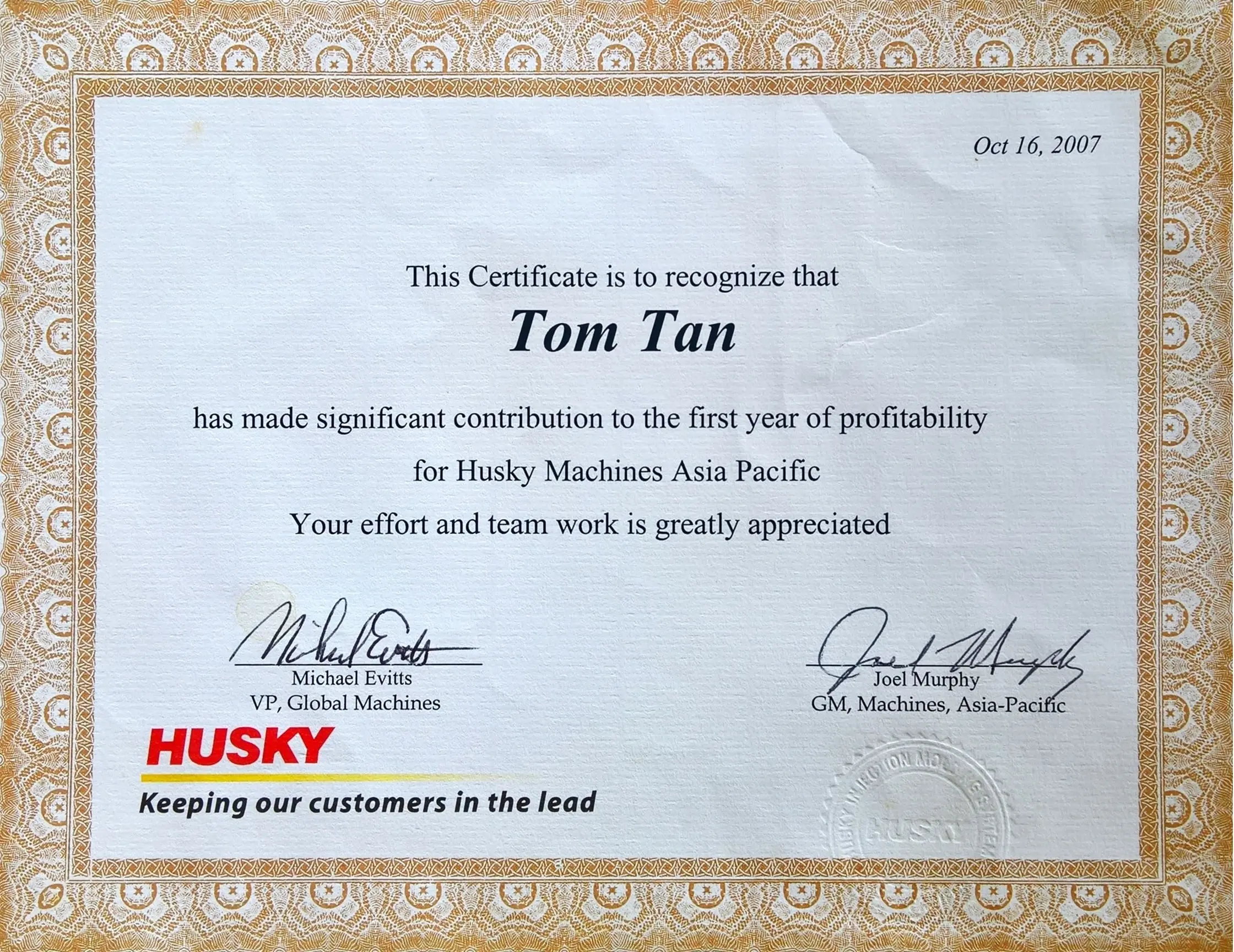 在第 1 年左右的时间里, 助力上海注塑机工厂建成, 并提前实现首次100万美元盈利。并因此获得全球机器制造部门 VP 签发“杰出贡献奖”。